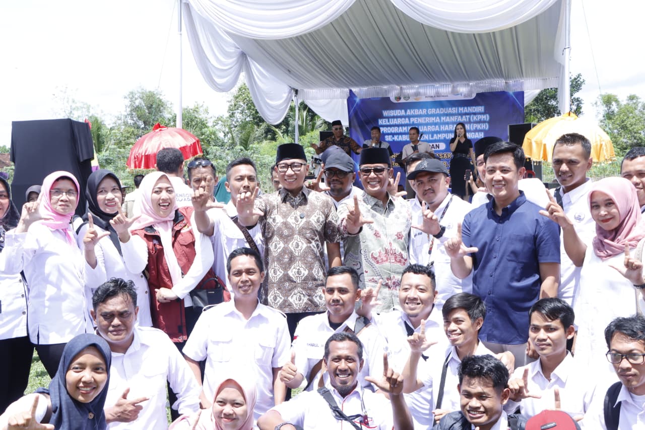 Lampung Tengah, Minggu (16/11/2025) — Bupati Lampung Tengah Ardito Wijaya bersama Wakil Bupati I Komang Koheri mendampingi Gubernur Lampung Rahmat Mirzani Djausal dalam gelaran Wisuda Akbar Graduasi Mandiri Keluarga Penerima Manfaat (KPM) Program Keluarga Harapan (PKH) se-Kabupaten Lampung Tengah, yang dirangkaikan dengan Peringatan HUT ke-4 Pasar Tradisional PKH Kampung Terbanggi Besar.