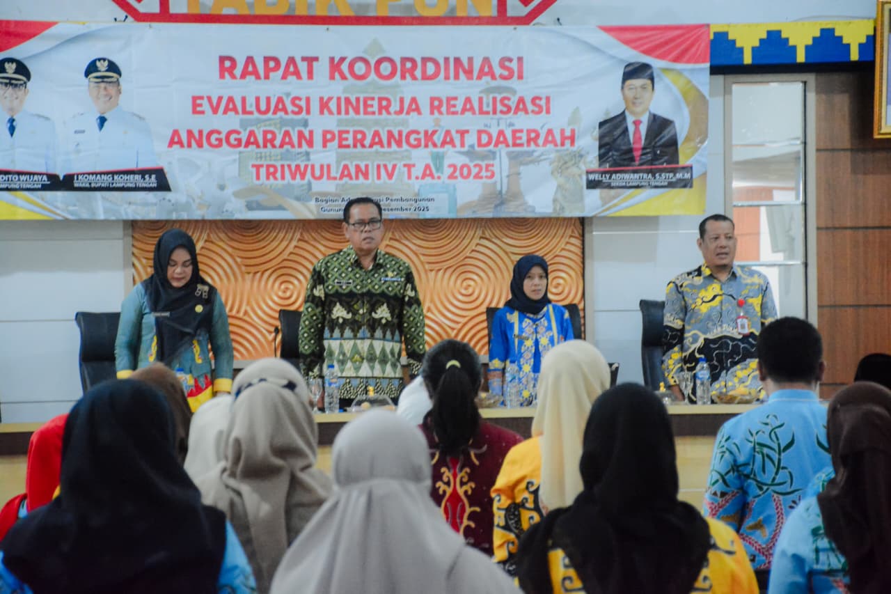 Lampung Top News, Lampung Tengah – Staf Ahli Bidang Ekonomi, Keuangan, dan Pembangunan Setdakab Lampung Tengah, Adi Sriyono, mewakili Bupati Ardito Wijaya, secara resmi membuka Rapat Koordinasi Evaluasi Kinerja Realisasi Anggaran Perangkat Daerah Triwulan IV Tahun Anggaran 2025. Kegiatan tersebut berlangsung di Ruang Rapat Siger Lantai IV, Kamis (4/12/2025).